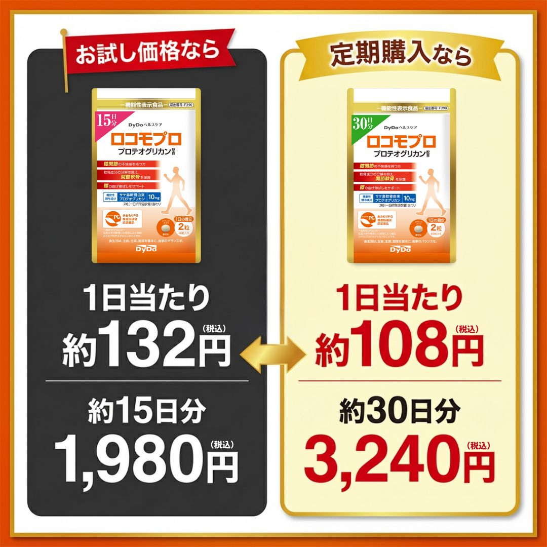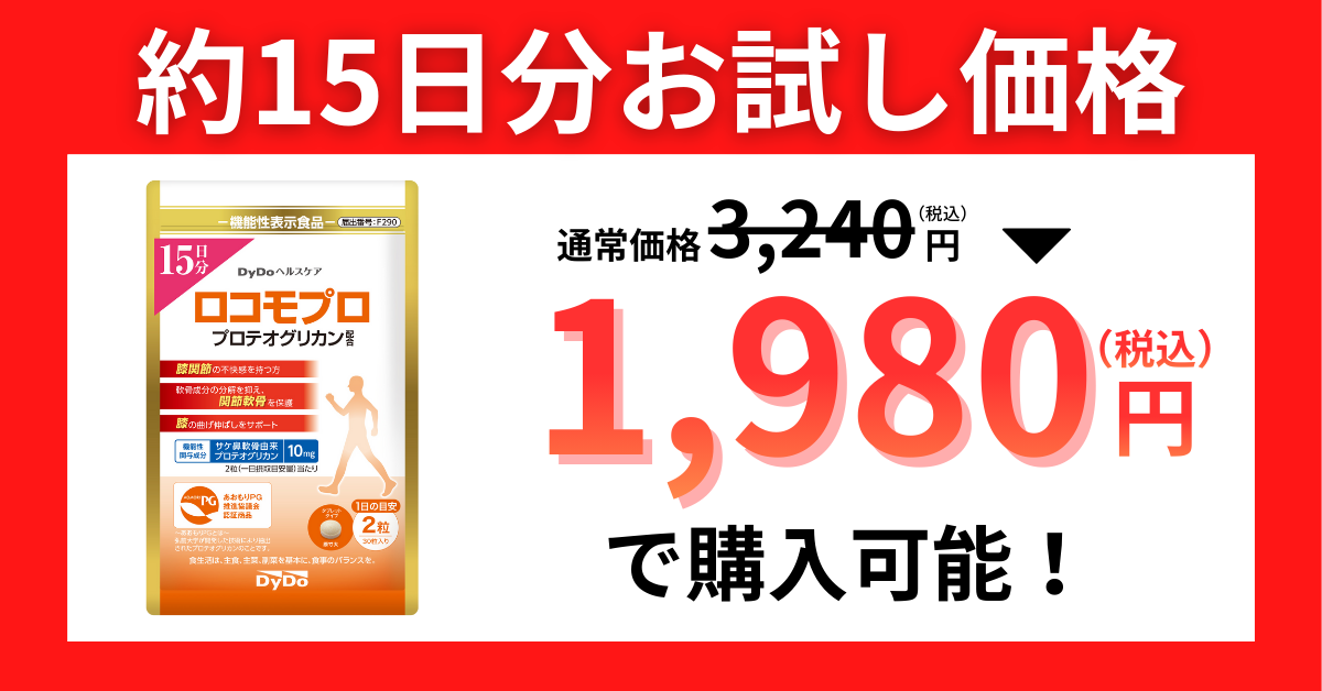 ロコモプロは気軽にお試しいただくために約15日分お試し価格を販売しているのですが、実は…さらにお得な方法があるので、ここまで読んでいただいた方だけにご案内しちゃいます!